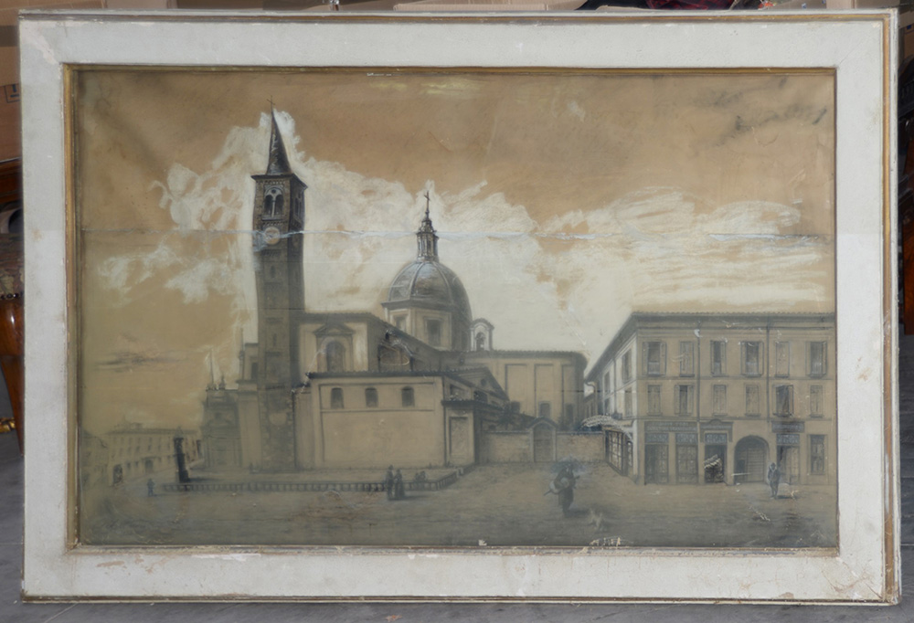 L. Pecora (Sec. XIX-XX) "Veduta del Duomo di Busto " 1902 disegno a carboncino e biacca (cm 95x160) firmato e datato in basso a sinistra, in cornice (difetti)