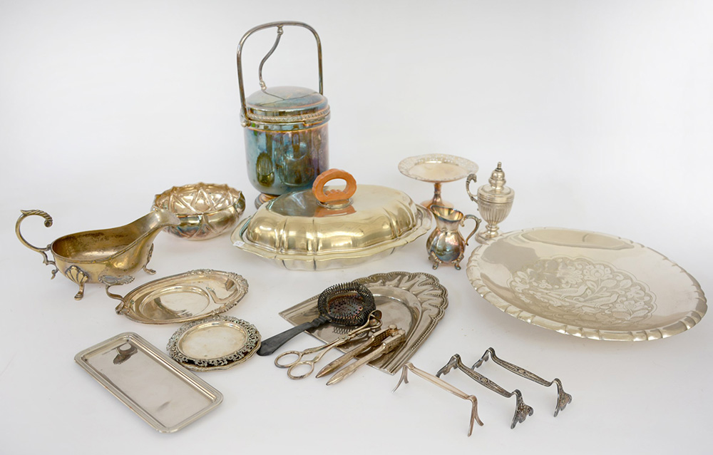 Lotto composto da una stoppiniera in argento e numerosi oggetti in metallo e metallo argentato (difetti)