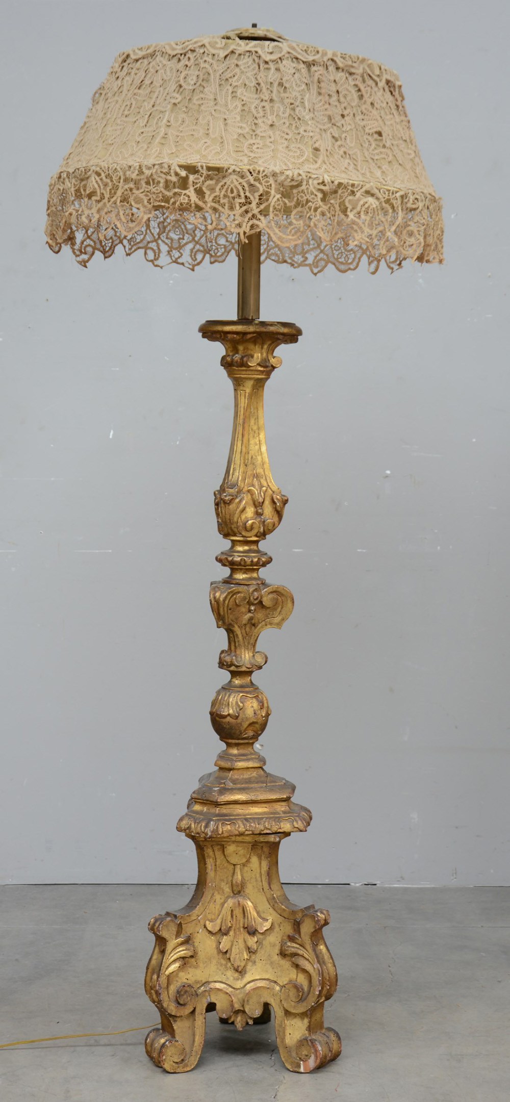 Torciera in legno intagliato e dorato a volute fogliate (h. cm 133) (difetti)