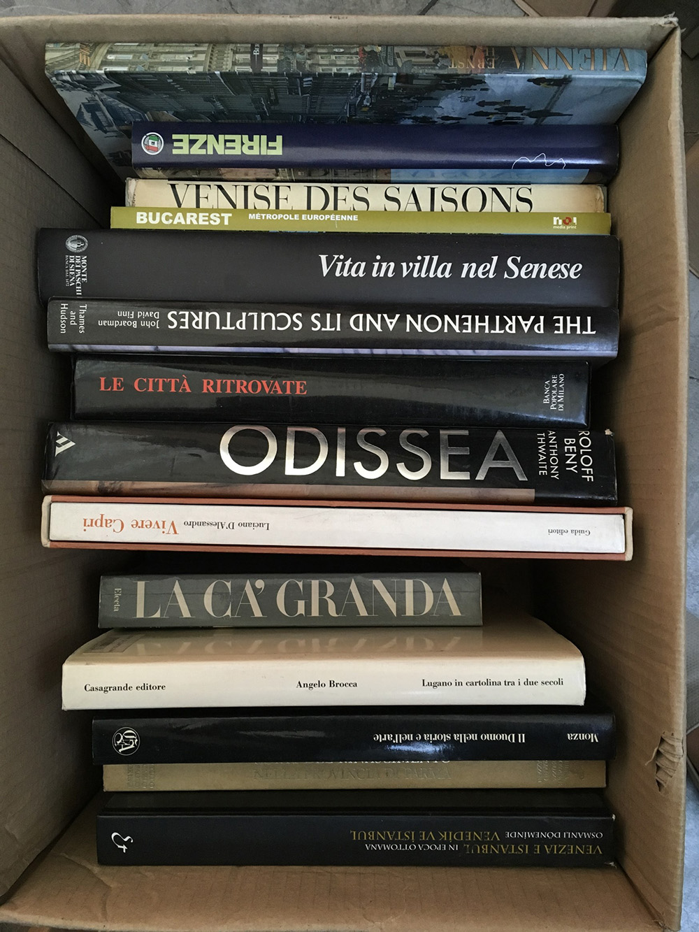 Lotto composto da due cartoni contenenti numerosi volumi illustrati inerenti le città europee ed le loro architetture (difetti)