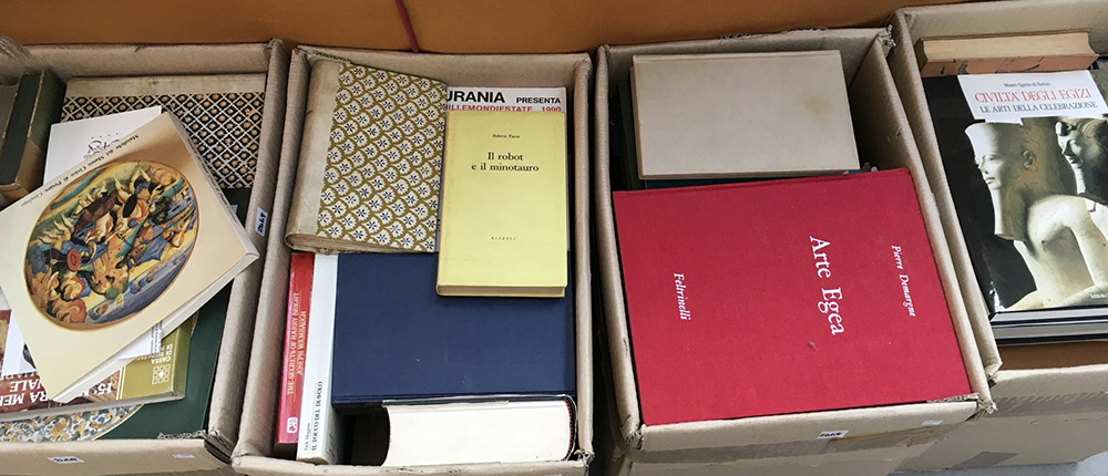Lotto di 4 cartoni contenenti numerosi romanzi e volumi inerenti l'arte e la storia.