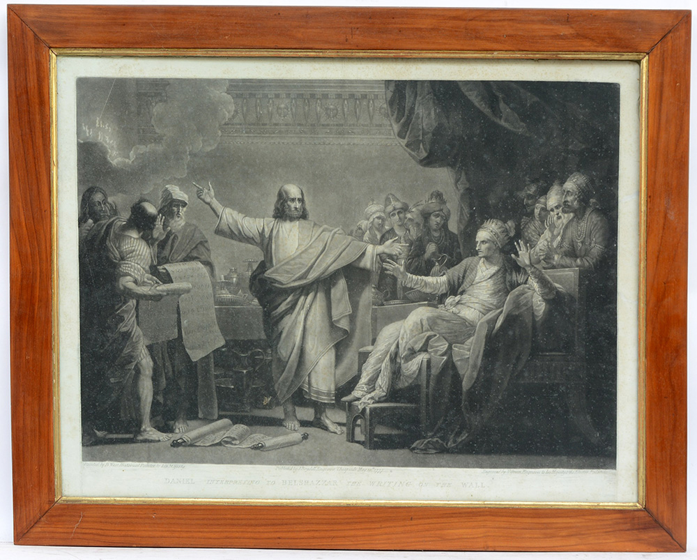 Incisione del sec. XIX raffigurante Daniele che spiega al re Baldassar la scrittura sul muro (cm 55x70) In cornice