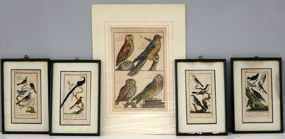Gruppo di otto incisioni a colori raffiguranti volatili (cm 10x7) Sec. XIX (difetti). Si aggiunge un'altra incisione a colori del medesimo soggetto in passepartout.