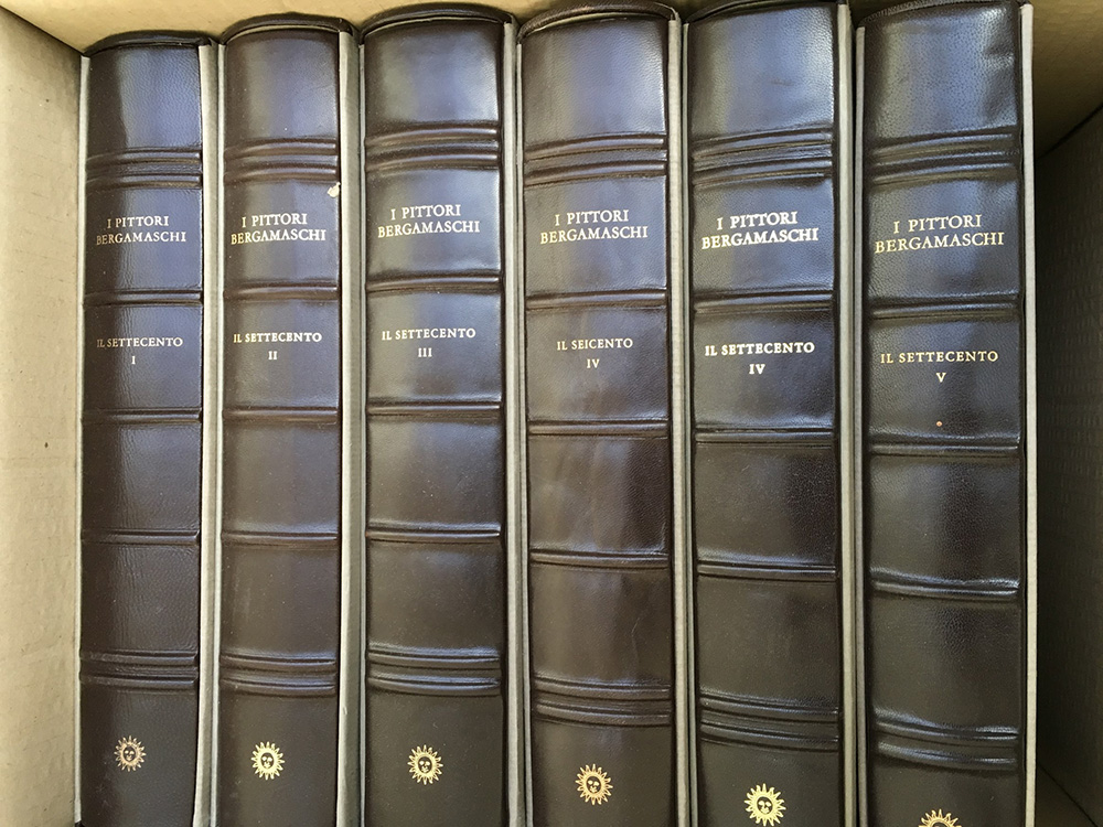 I Pittori Bergamaschi dal XII al XIX secolo. Raccolta di studi a cura della Banca Popolare di Bergamo. Bergamo: Poligrafiche Bolis Bergamo, 1982-92. 16 volumi in folio, con numerose illustrazioni in bianco e nero e apparati . Legatura in mezza pelle; entro cofanetto. Ottime condizioni. In 3 cartoni.