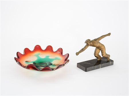 Lotto composto da una scultura in metallo raffigurante un giocatore di bocce (h cm 16) e un’alzatina in vetro di Murano trasparente verde, incolore e rosso (d cm 28) (difetti e restauri)