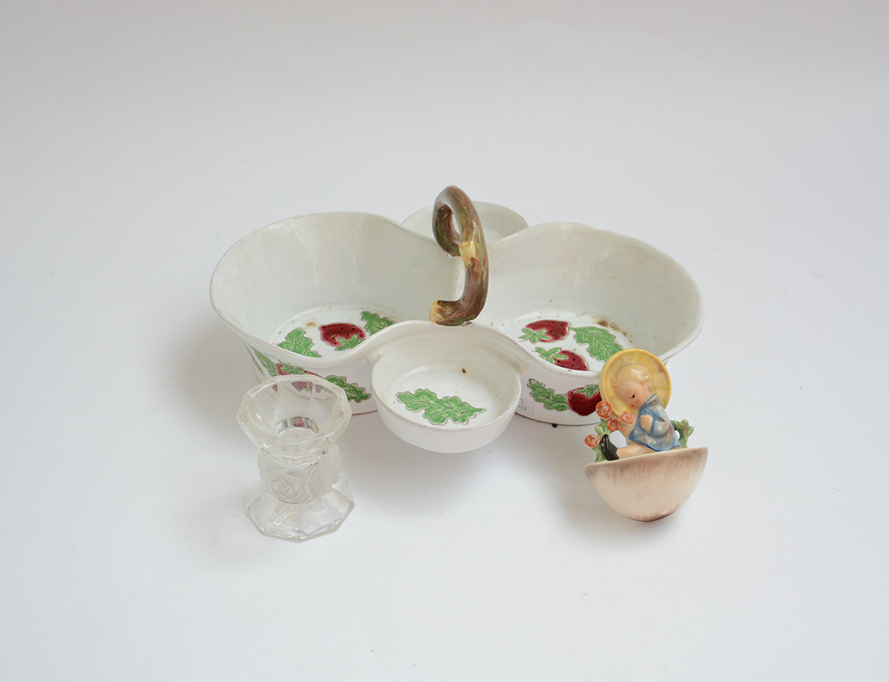 Lotto composto da un'acquasantiera marcata Hummel, un candeliere in vetro e un centrotavola decorato a fragole (l max 30 cm; h max 10 cm) (difetti)