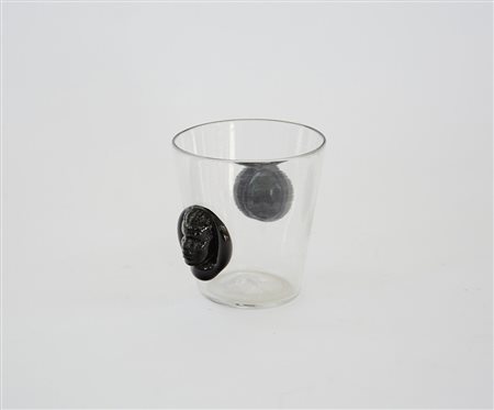 Manifattura di Murano Bicchiere in vetro soffiato trasparente con applicazioni in pasta vitrea nera raffiguranti volti. Sec XX (h cm 9,5)