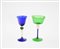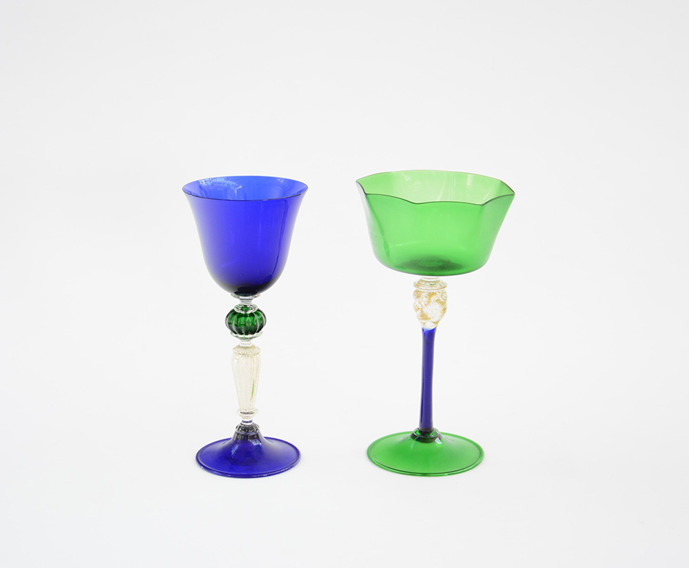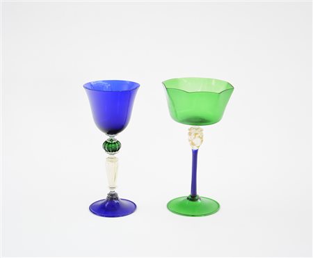Manifattura di Murano Lotto composto da due calici in vetro soffiato verde, blu e incolore con applicazione di foglia d’oro. Sec XX (h cm 21)