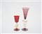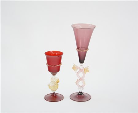Manifattura di Murano Lotto composto da due calici in vetro soffiato di diversi colori con fusti decorati. Sec XX (h cm 32 e h cm 20)