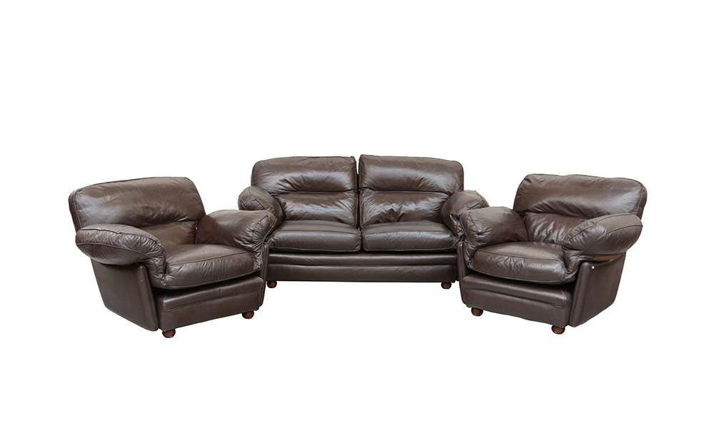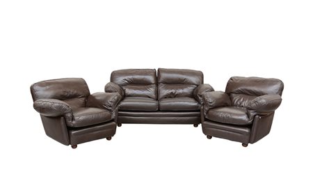 Fornitura da salotto composta da divano a due posti e due poltrone rivestite in pelle marrone. Italia, anni 70 (difetti)