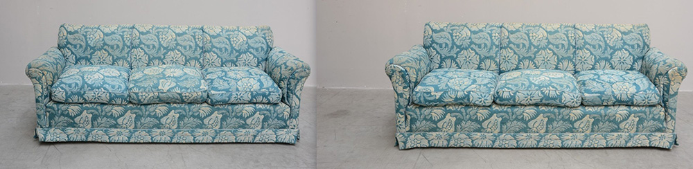 Coppia di divani a tre posti con rivestimento a tessuto fiorato color carta di zucchero (difetti)