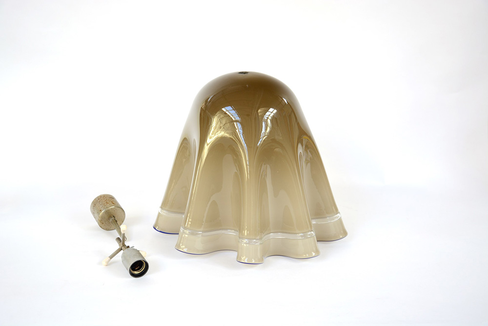 Manifattura di Murano Lampada a sospensione con diffusore in vetro soffiato incamiciato a fazzoletto di colore tortora, trasparente e blu. Produzione recente (lievi difetti)