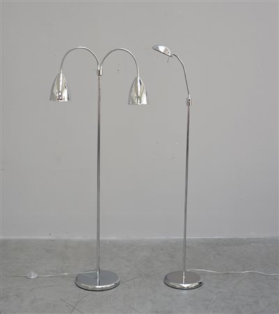 Lotto di due lampade a stelo ad una e due luci con struttura in metallo cromato e braccia flessibili, basamento circolare (h max cm 174 ca) (difetti)