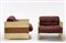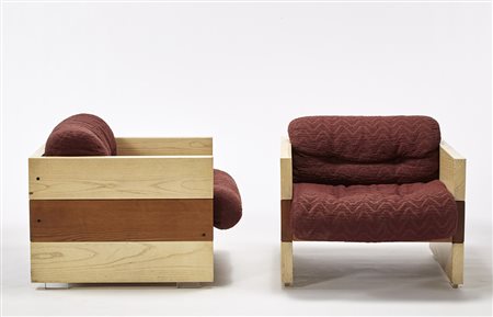 Coppia di poltrone in legno massello bicolore con cuscini poggiaschiena e sedute rivestiti in tessuto marrone, piedini in plexiglass. Produzione italiana, anni 70 (cm 77x56,5x77) (difetti) -EN A pair of armchairs. Solid bicolor wood, brown fabric, plexiglass. Italy, 1970s (cm 77x56,5x77) (defects)