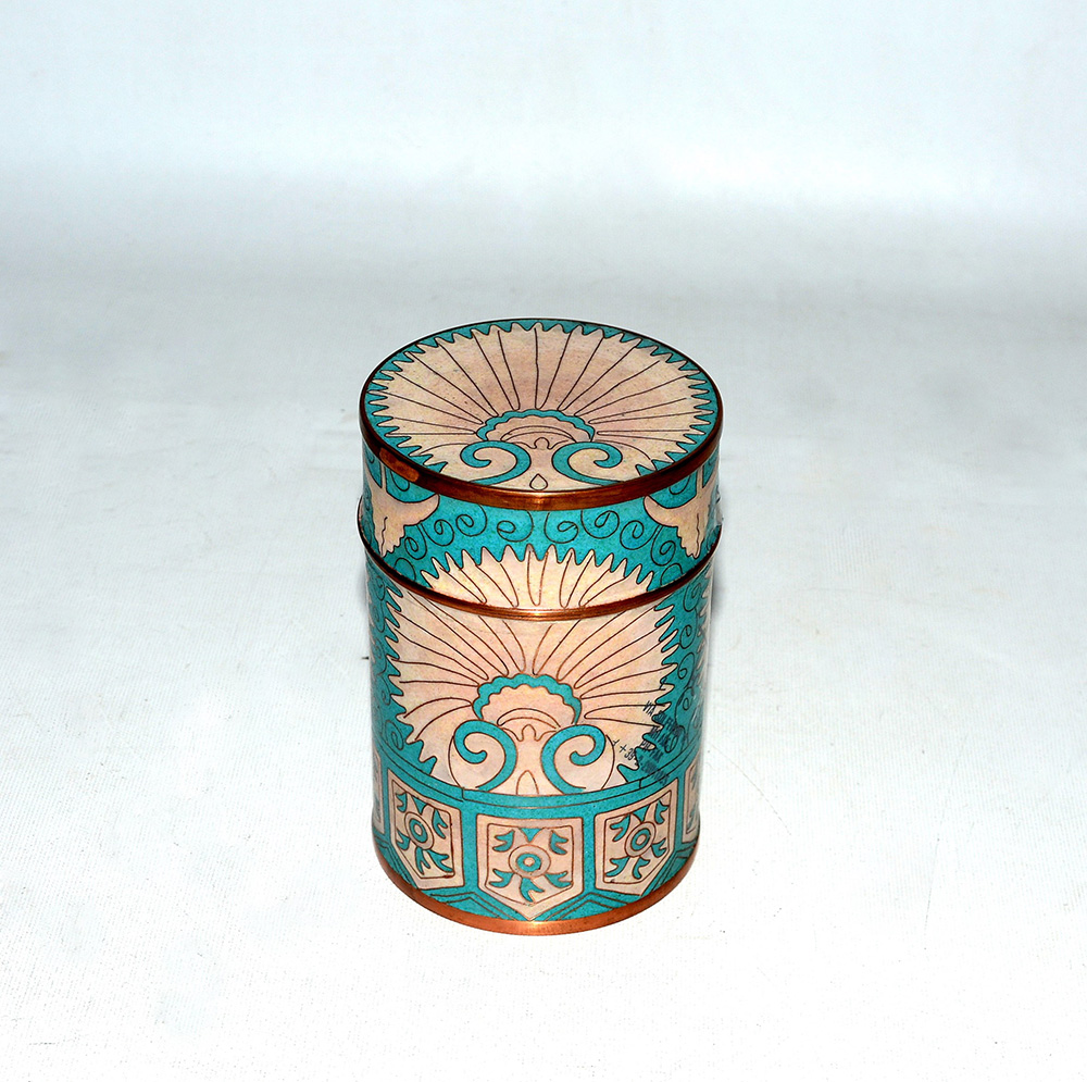 Fabienne Jouvin Scatola da thé in rame smaltato con decoro turchese e beige modello "Eventail Bleu". Parigi, produzione recente (h cm 13,5) (lievi difetti)