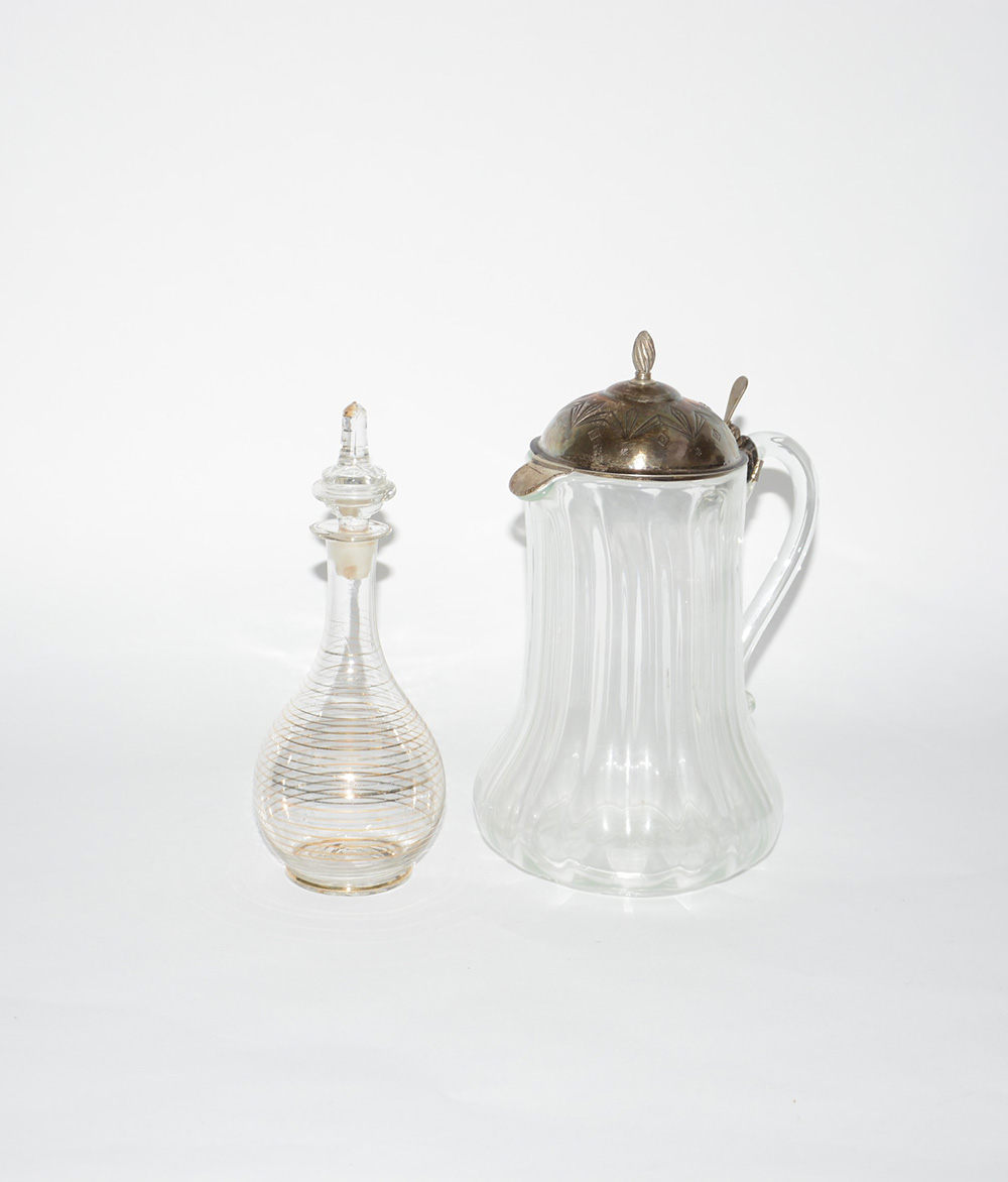 Lotto composto da una bottiglia e un versatoio in vetro soffiato. Sec XX (difetti)