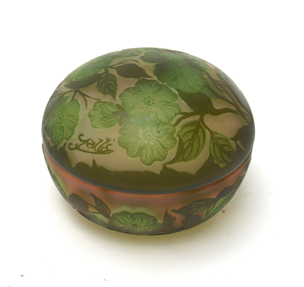 Ciotola con coperchio in vetro a cammeo recante firma "Gallé" (d cm 14, h cm 9)