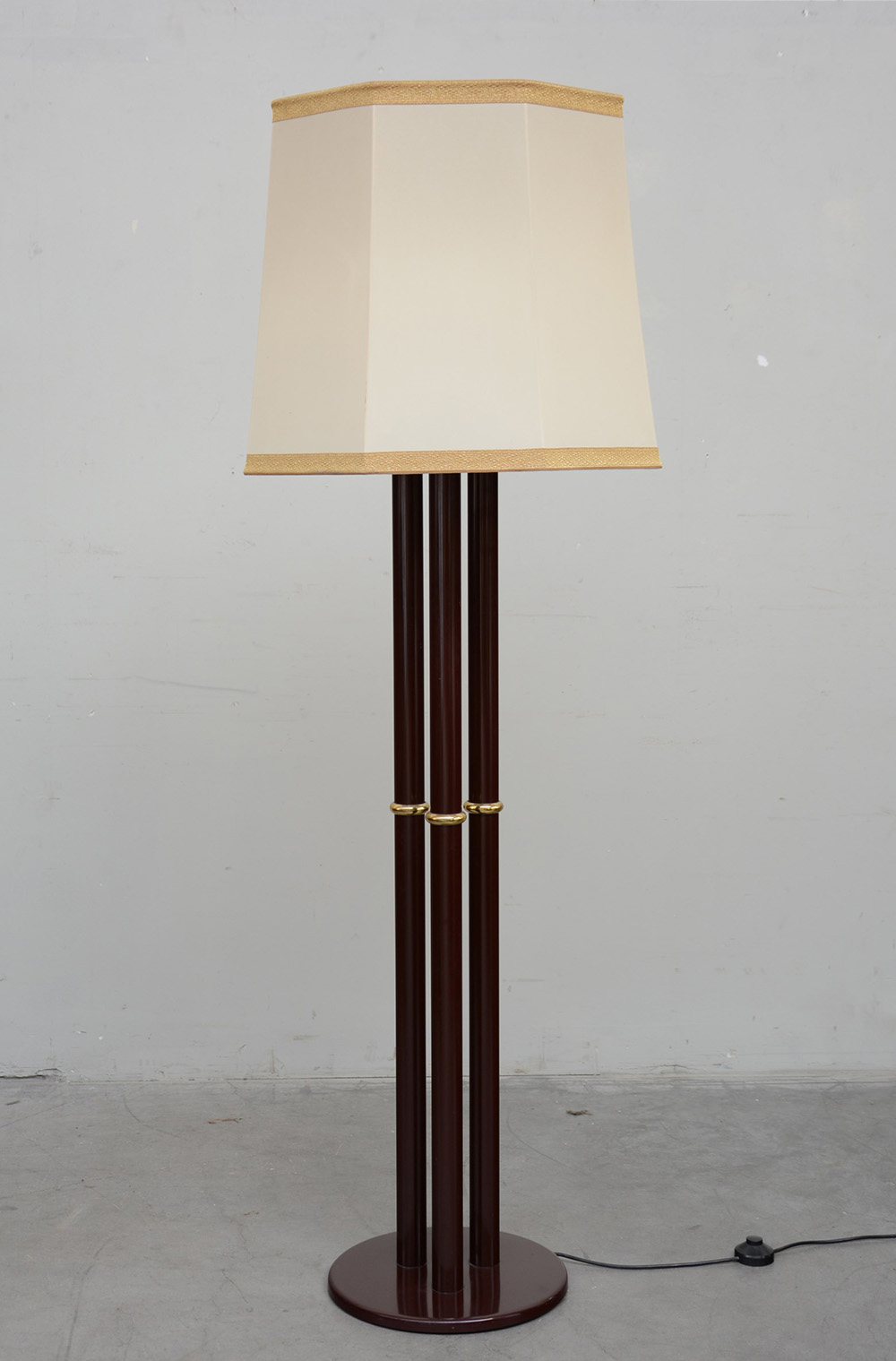 Lampada da terra con fusto a tre montanti laccato in marrone con paralume. Italia, anni 80 (h cm 157) (lievi difetti)