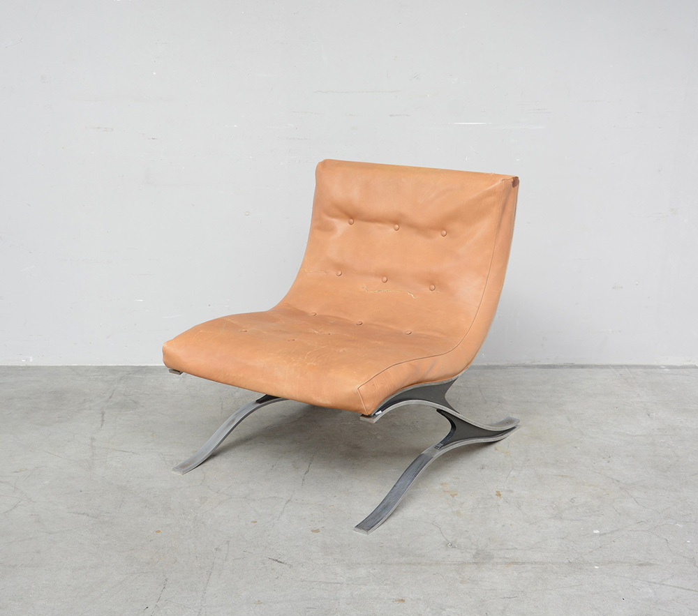 Poltrona imbottita con struttura in acciaio cromato e seduta rivestita in cuoio beige. Produzione Pizzetti, Roma, anni 70 (cm 70x89x85) (difetti)