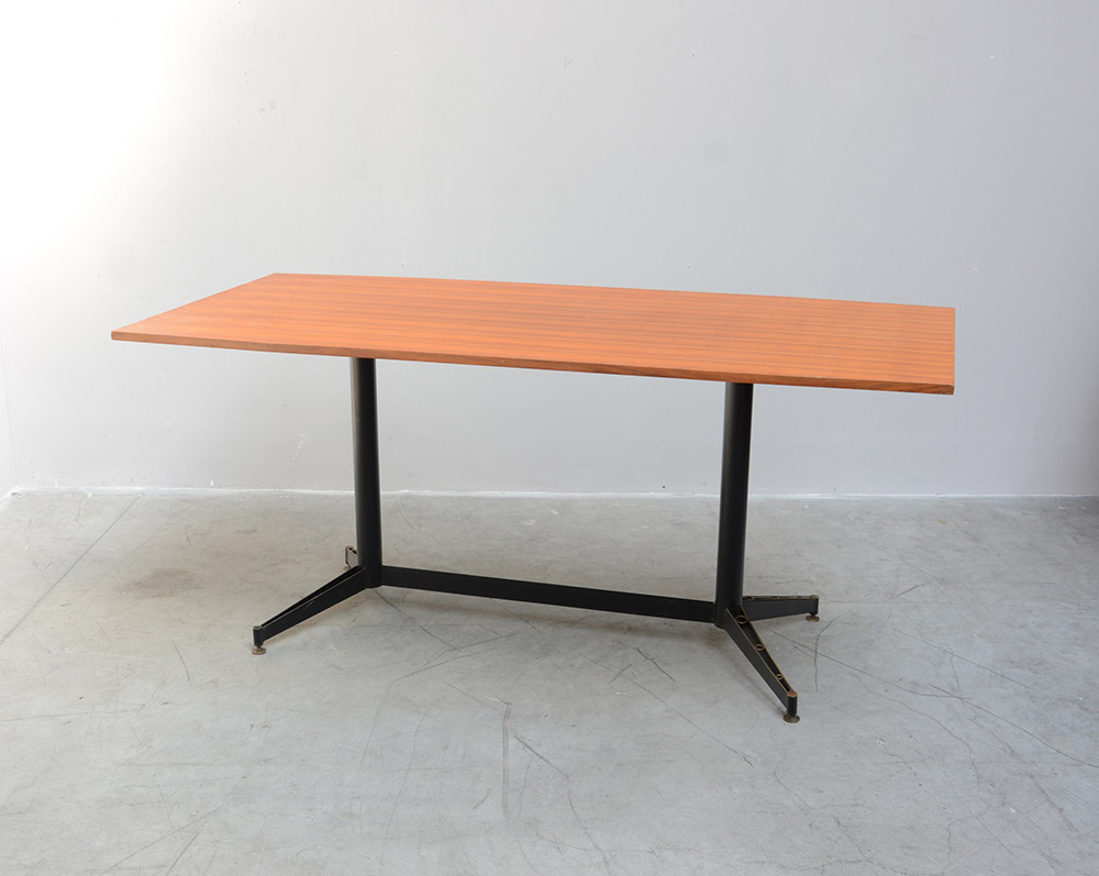 Tavolo con piano impiallacciato in legno di noce. Struttura in acciaio verniciato nero e ottone. Italia, anni 60 (cm 169x75x79) (lievi difetti)