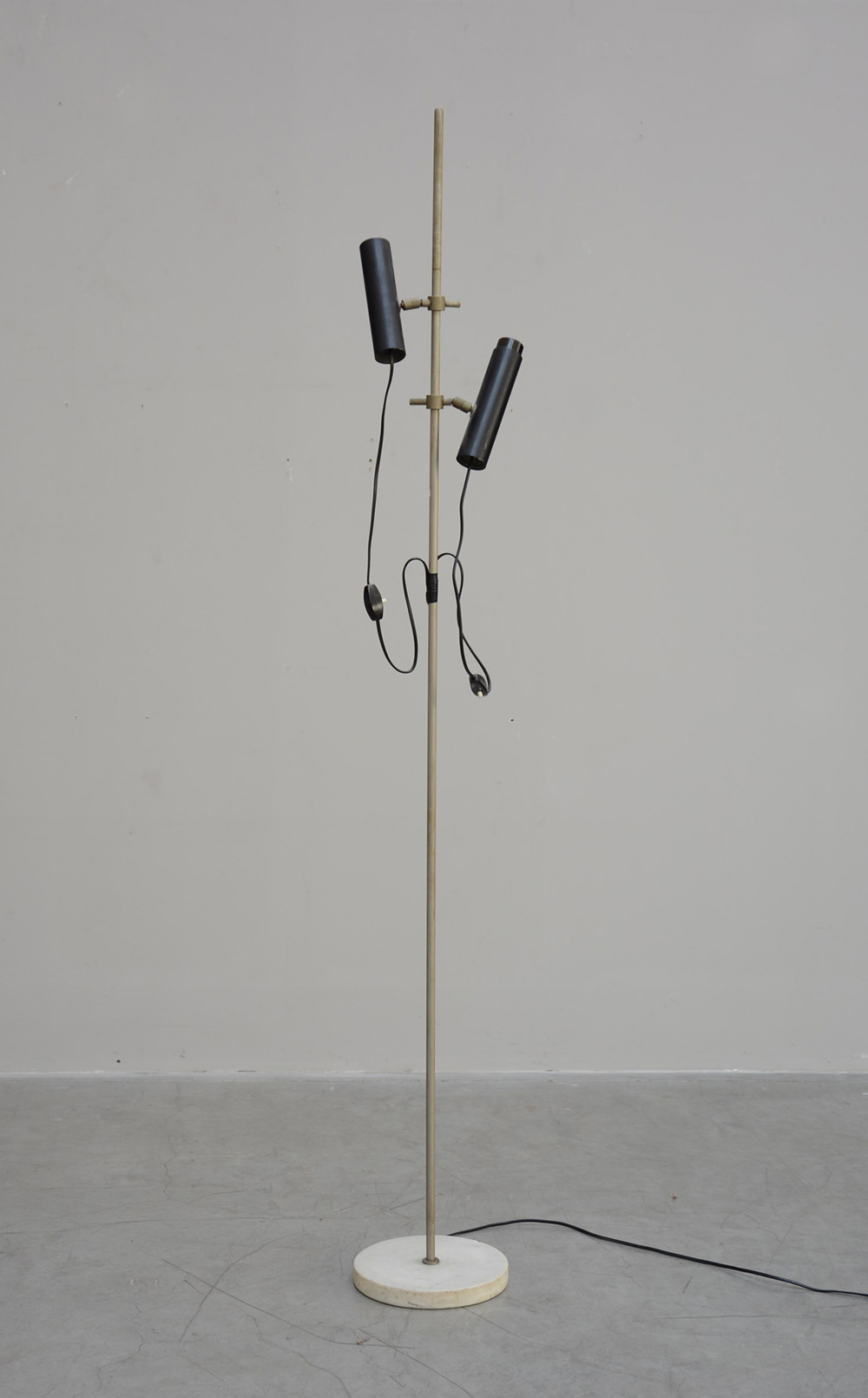 Lampada da terra a due luci orientabili con fusto in metallo nichelato e basamento in marmo recante etichetta "Arte industriale Milano" (h cm 170) (difetti)