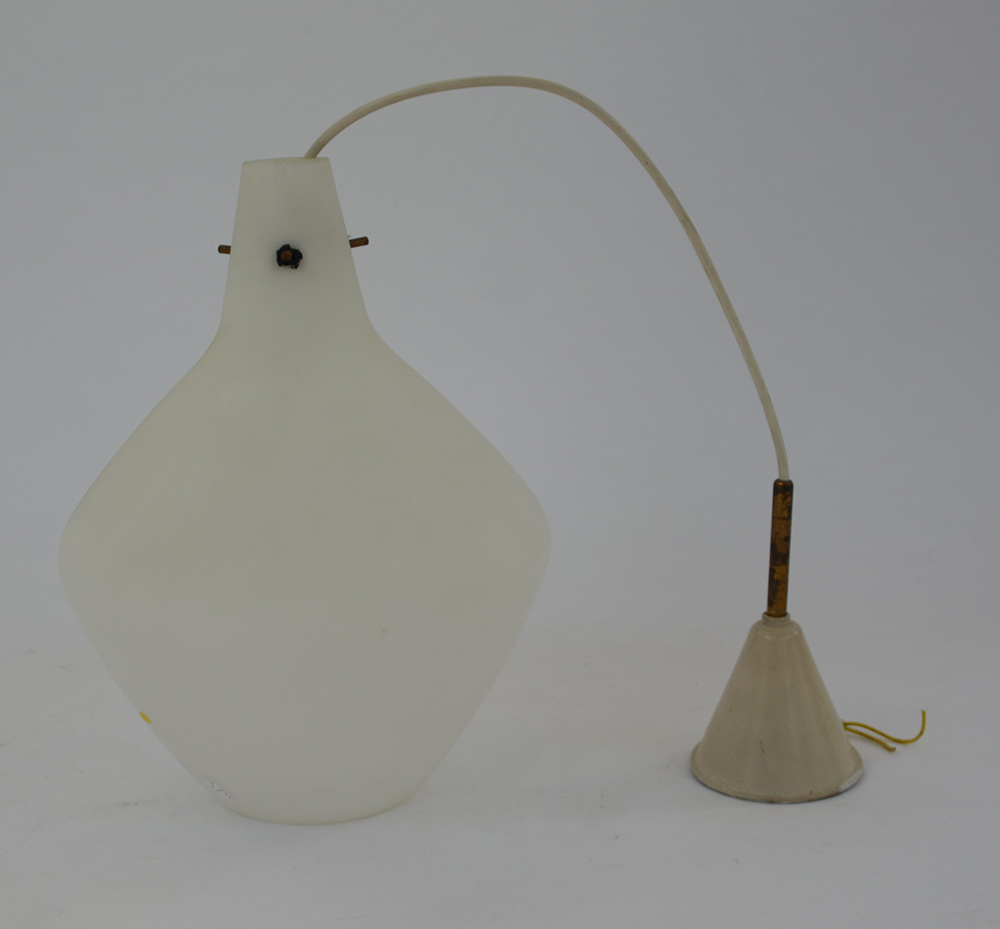 Lampada a sospensione in vetro incamiciato lattimo satinato sulla superficie esterna, struttura in alluminio laccato bianco e ottone. Italia, anni 60 (h cm 92) (lievi difetti)
