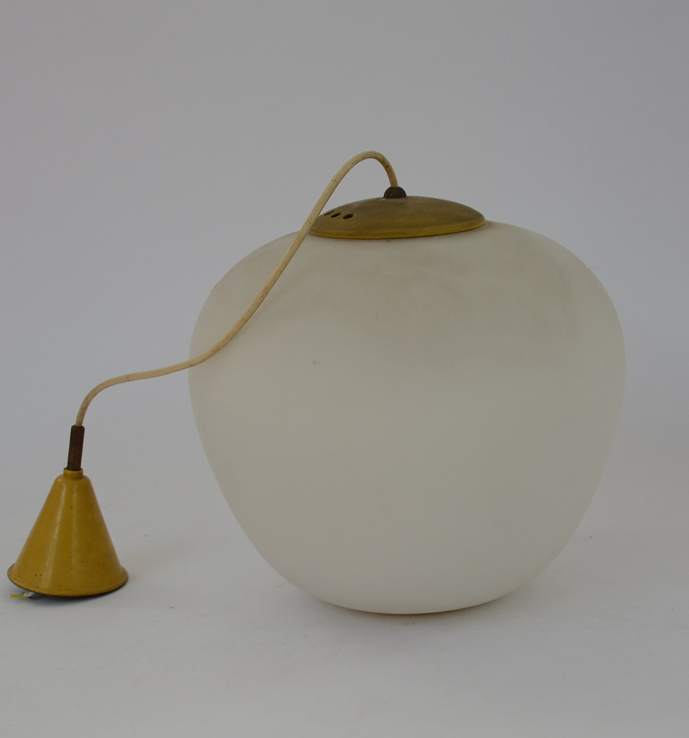 Lampada a sospensione in vetro incamiciato lattimo satinato sulla superficie esterna, struttura in alluminio laccato giallo e ottone. Italia, anni 60 (h cm 84) (lievi difetti)