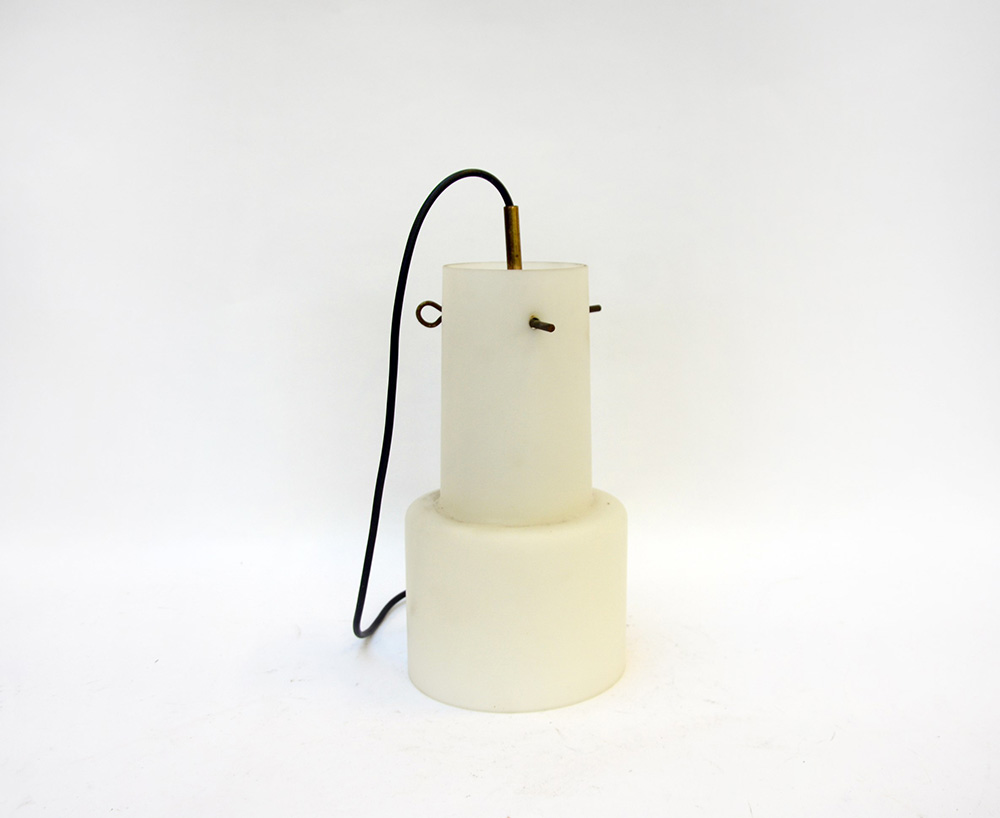 Lampada a sospensione in vetro incamiciato lattimo satinato sulla superficie esterna, struttura in alluminio laccato nero e ottone. Italia, anni 60 (h cm 33) (lievi difetti e mancanze)