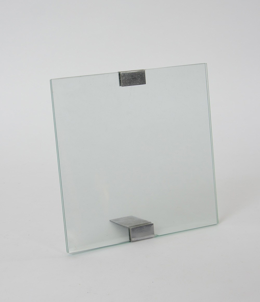 Bruno Munari (Milano 1907 - 1998) Portafoto modello "Galapagos". Produzione danese, Milano, 1961. Vetro temperato e acciaio inox (cm 24x24) (lievi difetti)