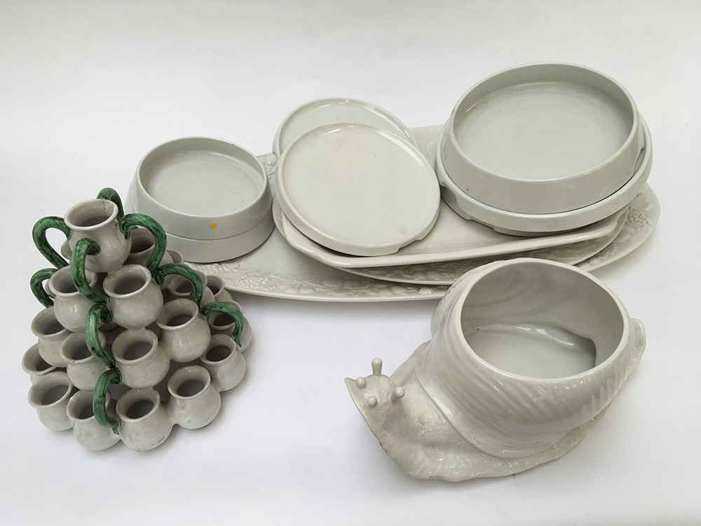 Lotto composto da tre vassoi da portata, sette piatti in ceramica bianca marcati “Pierre Cardin-Ceramica Franco Rossi”, una zuppiera a forma di lumaca marcata “Bassano” mancante del coperchio e un centrotavola composto a piccole anfore sovrapposte (difetti)