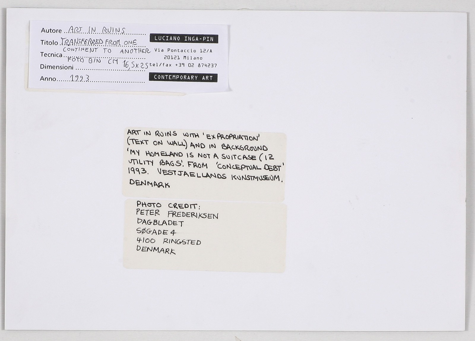 Foto di Peter Frederiksen dell'installazione "Exploration" tenuta presso il Vestjallands Kunstmuseum, Danimarca. Al retro reca il cartiglio della galleria Luciano Inga-Pin, Milano. Cornice presente.
