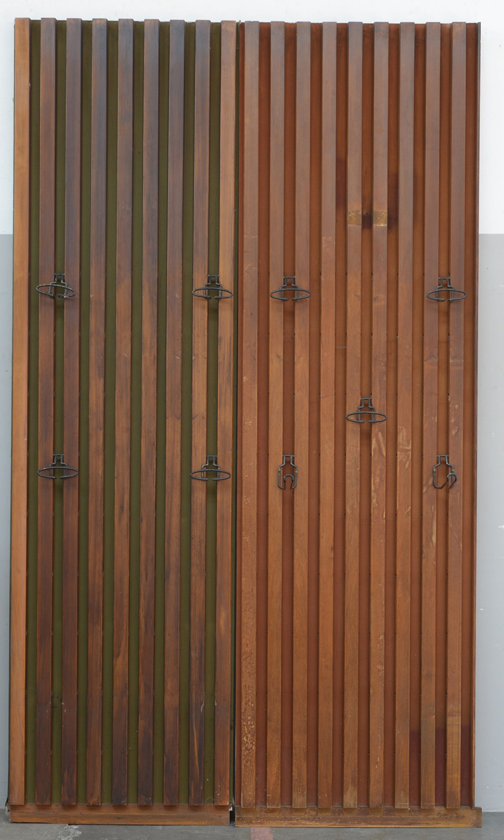 Sistema appendiabiti da parete in legno ad angolo con grucce in metallo. Produzione Cantieri Carugati, Rovellasca, Italia, 1958 ca. (un modulo cm 275x84x10) (difetti) Bibliografia: "Rivista dell'arredamento", n. 67, luglio 1960, pubblicità