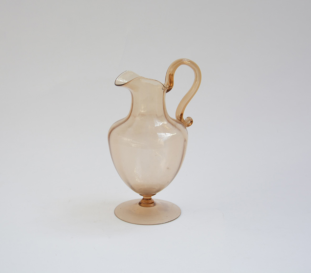 Manifattura di Murano. Brocca leggermente costolata in vetro soffiato pagliesco. Anni 20 (h cm 27)