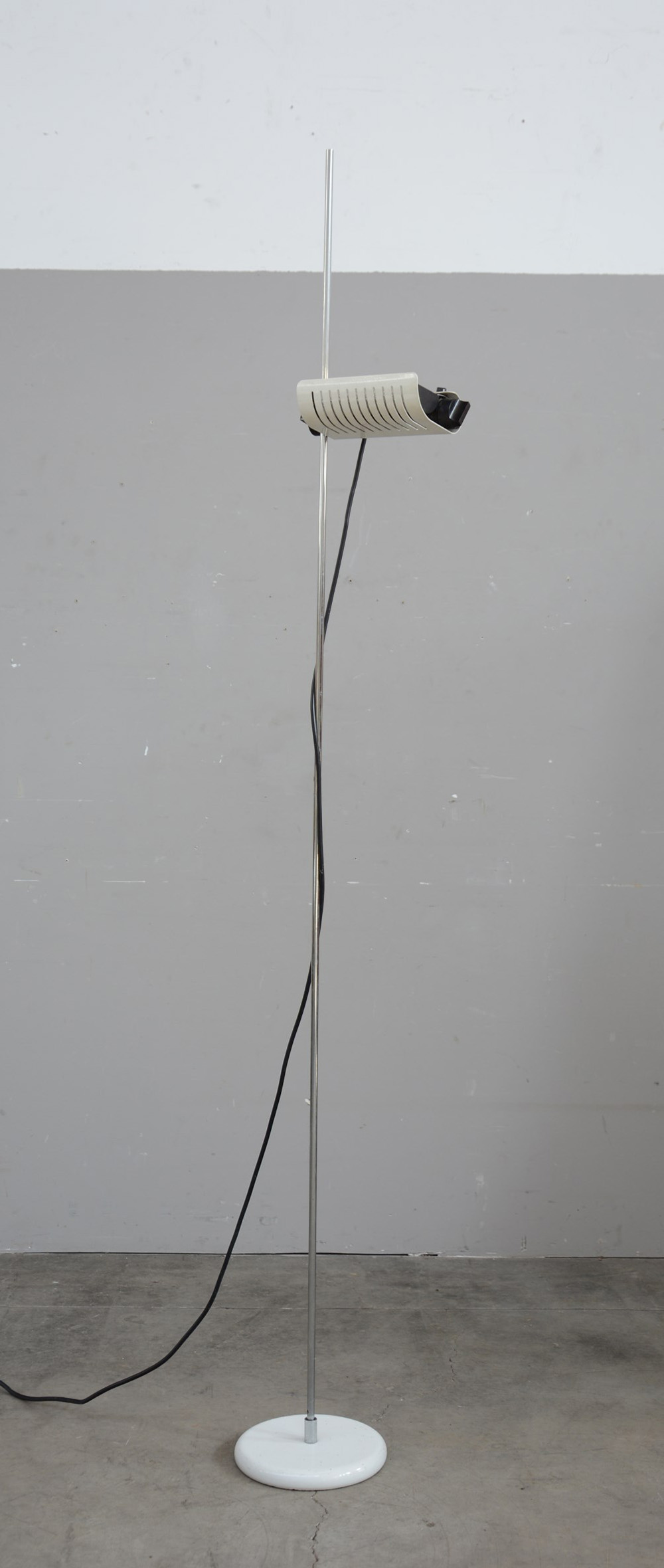 Joe Colombo (Milano 1930 - 1971) Lampada da terra modello "626" con base e paralume in metallo laccato bianco e struttura cromata. Produzione O-Luce, anni 70 (h cm 210) Bibliografia: G. Gramigna, Repertorio del design italiano 1950-2000 per l'arredamento domestico, vol I, Allemandi, Torino 2003, p. 184