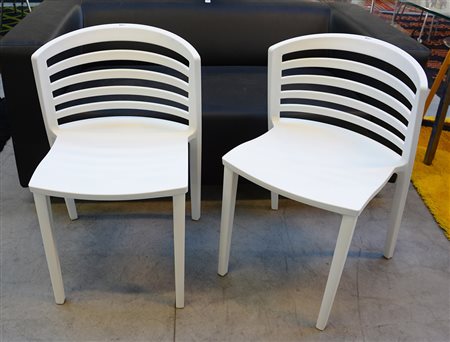 Paolo Favaretto Coppia di sedie modello "Venezia". Produzione recente Sintesi. Polipropilene bianco. Premio Compasso d'oro Selection ADI 2008 (cm 52x77x51)