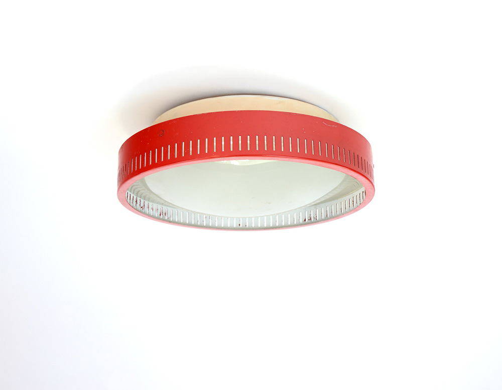 Stilnovo Plafoniera con struttura in alluminio verniciato rosso e bianco e paralume in vetro. Marchio incusso al retro (d cm 36) (lievi difetti)