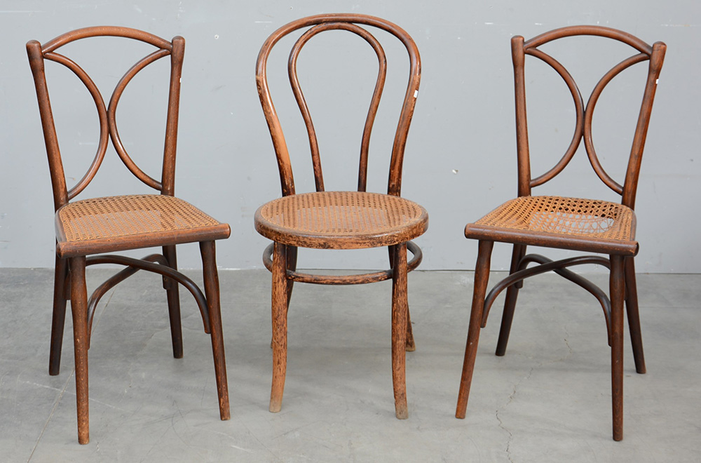Coppia di sedie thonet in faggio curvato unite ad una diversa. Etichette...