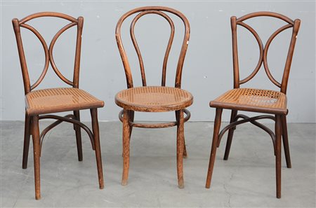Coppia di sedie thonet in faggio curvato unite ad una diversa. Etichette sotto la fascia (h cm 35) (difetti)