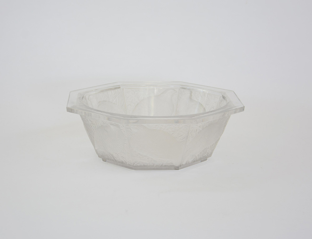 Fruttiera in vetro incolore soffiato in stampo decorato con pernici e racemi vegetali. Sec XX. Firmato a punta “Lalique, France” sotto la base (d cm 31,5) (lievi difetti)