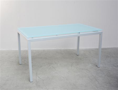 Bruno Rainaldi Tavolo modello "Tavola". Produzione Sintesi. Acciaio grigio e vetro temperato e serigrafato (cm 140x74x80)