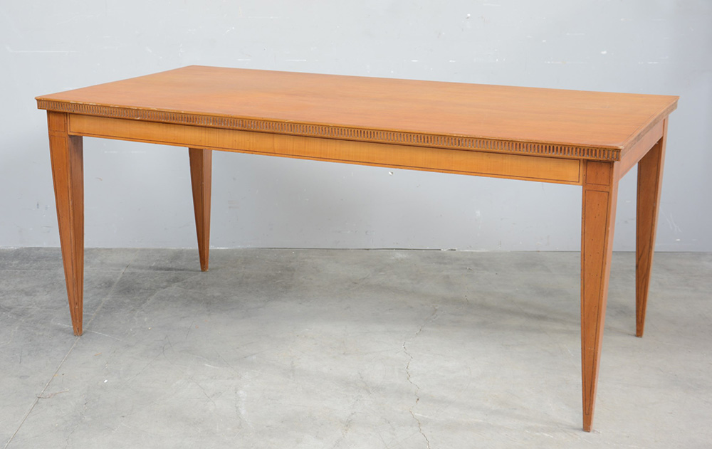 Tavolo rettangolare in legno con fascia dentellata e gambe rastremate. Italia...