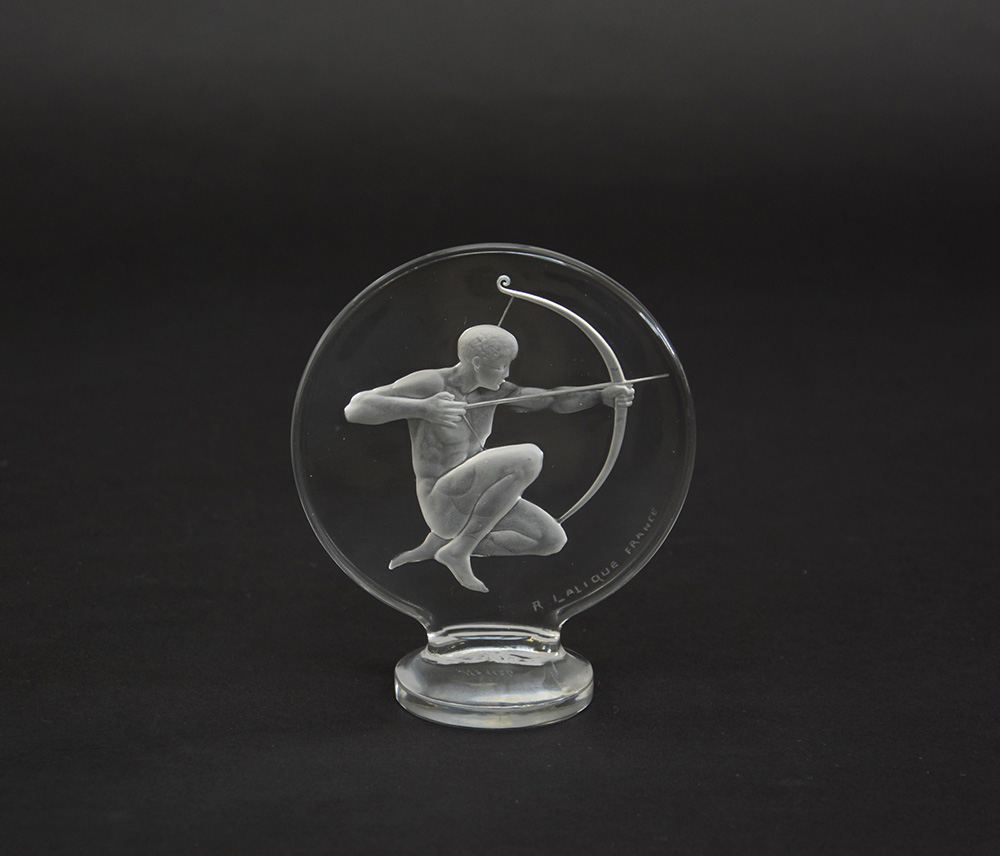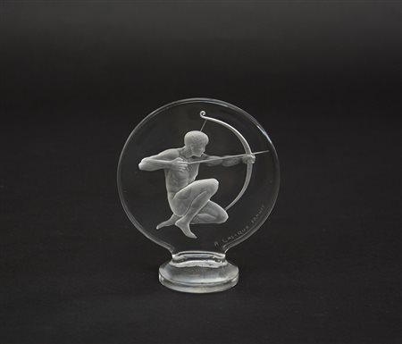 Lalique, Francia Tappo da radiatore in vetro soffiato in stampo inciso con figura di arciere. Firmato a punta “R LALIQUE FRANCE” e numerato 1126 (h cm 12)
