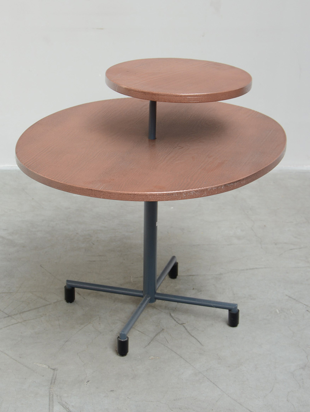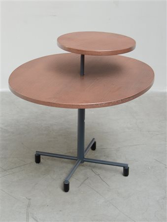 Laura Griziotti Prototipo di tavolino a due piani con piano superiore girevole. Produzione BBB Bonacina, anni 80 (cm 75x62x64)