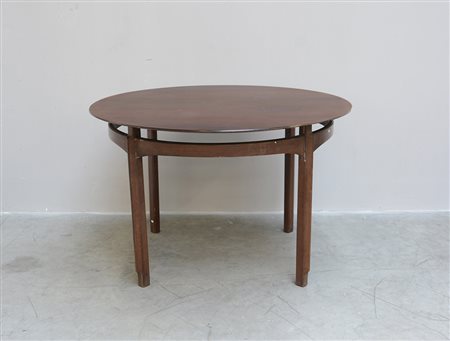 Tavolo circolare in legno massello e multistrato di palissandro indiano. Produzione italiana, anni 60 (d cm 118,5 e h cm 75) (difetti)