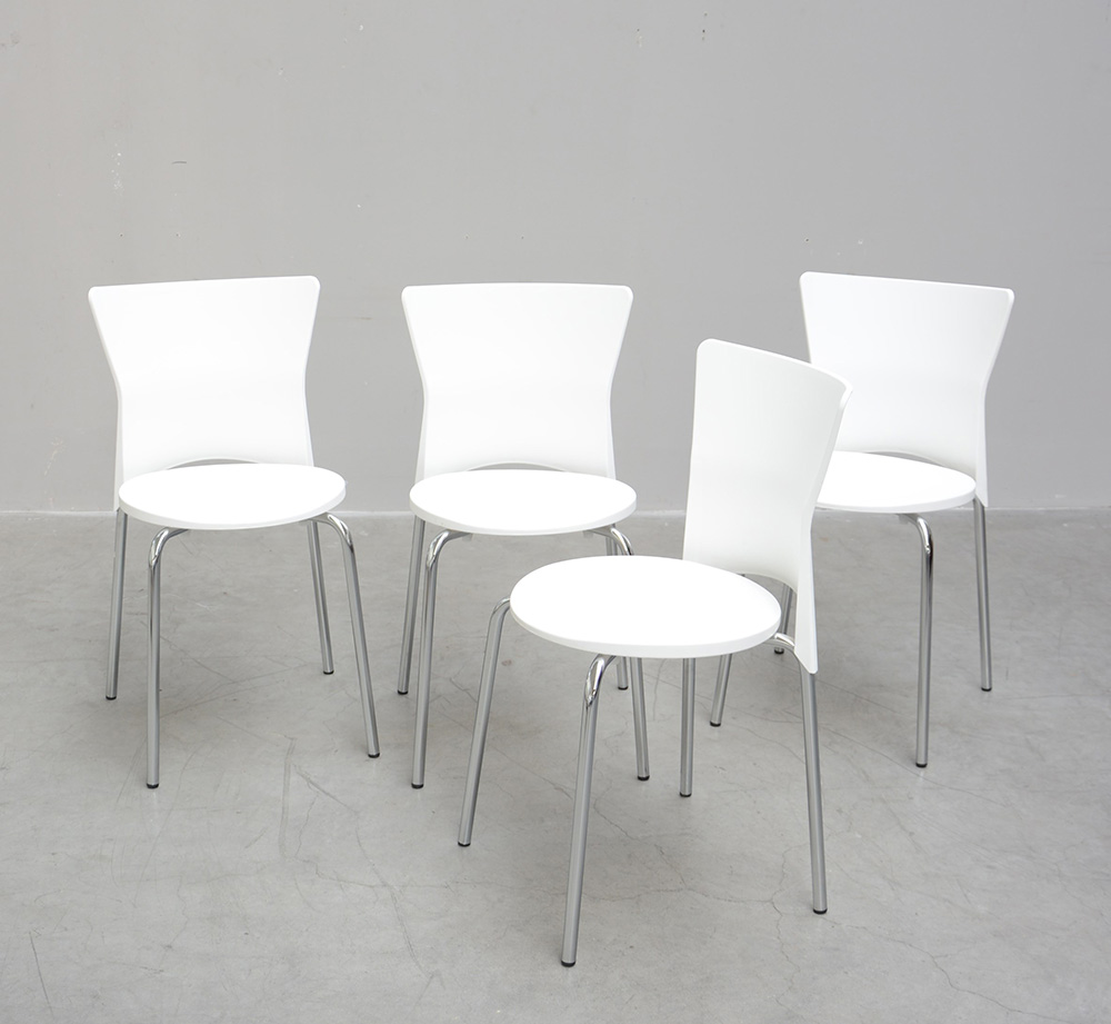 Olaf Van Bohr Lotto composto da quattro sedie modello "Isis". Produzione Sintesi. Acciaio e polipropilene bianco (cm 42x77x50)