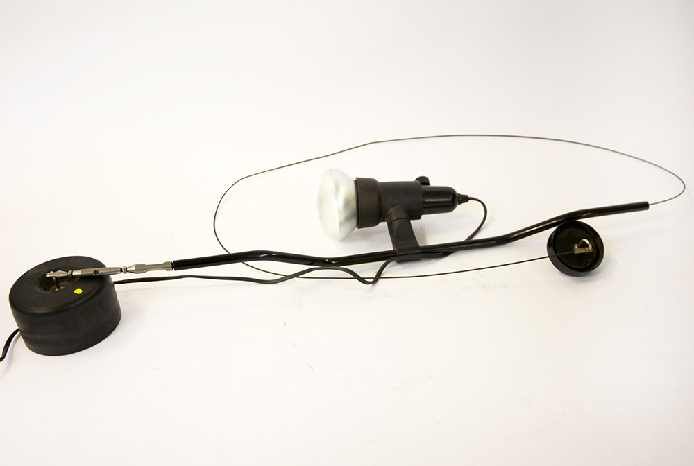 Achille Castiglioni (1918 - 2002) e Pio Manzù (1939 - 1969) Lampada da parete modello "Parentesi". Produzione Flos, Milano, 1971. Cavo d'acciaio, tubolare in metallo, materiale plastico e zavorra in fusione di ghisa. Modello vincitore del premio Compasso d'oro 1979 (h cm 235) (lievi difetti)