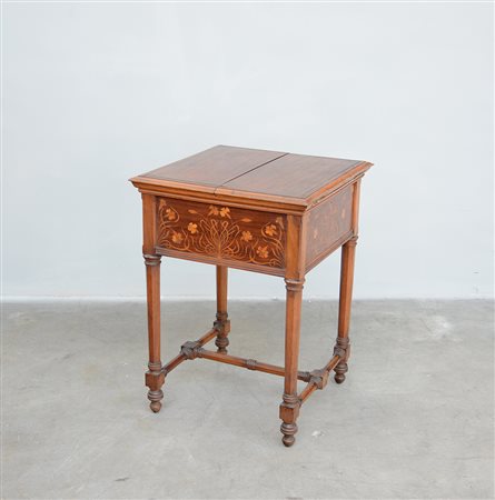 Manifattura Casalini, Faenza. Tavolino liberty da salotto a quattro gambe riunite da traversa con fascia intarsiata a garofani, piano apribile a libro per l'estrazione del vassoio (cm 54x74x54)(difetti)