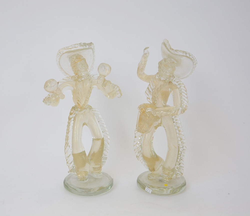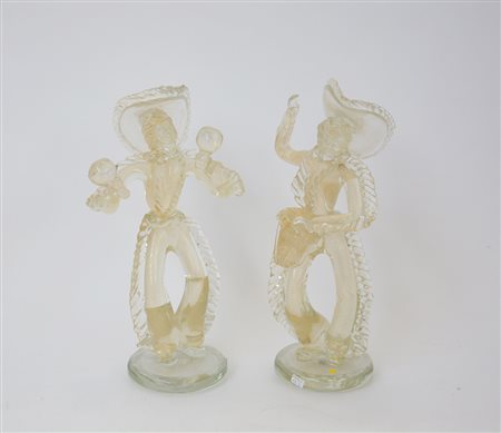 Manifattura di Murano, due figurine in vetro massello trasparente incolore con inclusione di polvere d'oro raffiguranti due suonatori. Italia, fine anni 60 (h cm 35) (lievi difetti)
