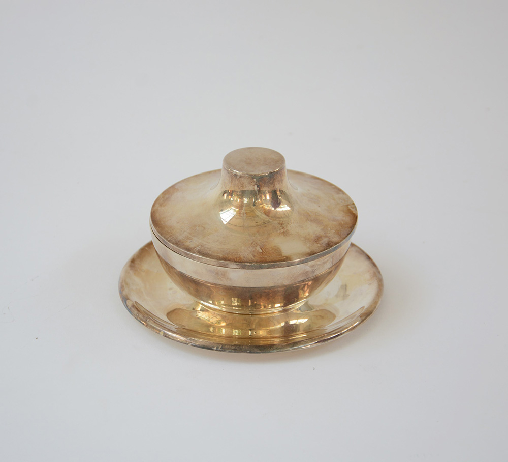 Lino Sabattini (1925 - 2016) Zuccheriera in metallo argentato completa di piattino (d cm 11, h cm 9) (lievi difetti)