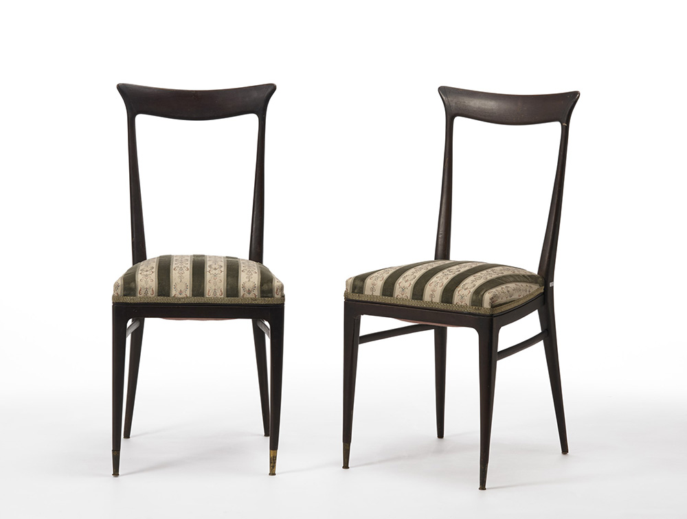 Guglielmo Ulrich (Milano 1904 - 1977) (attribuito) - Coppia di sedie in legno con gambe rastremate e puntali anteriori in ottone, seduta imbottite e schienale a giorno. Italia, fine anni '50 (difetti)